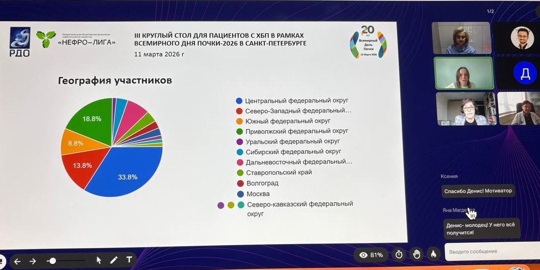 Онлайн-встреча состоялась 11 марта и объединила пациентов с хронической болезнью почек, специалистов в области нефрологии, диализа и трансплантации, а также представителей медицинских организаций. Круглый стол был открыт для всех желающих.