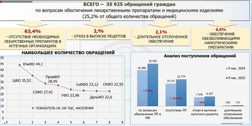 Росздравнадзор фиксирует рост числа жалоб граждан, связанных с обеспечением лекарственными препаратами и медицинскими изделиями. За девять месяцев 2025 года по сравнению с аналогичным периодом прошлого года число таких обращений выросло с 30,4 тыс. до 35,9 тыс. (+18%), что составляет четверть от всех жалоб, которые поступают на оказание медицинской помощи в стране, сообщила 20 октября заместитель руководителя федеральной службы Елена Шешко на «круглом столе» по вопросам доступности лекобеспечения в Совете Федерации.