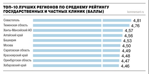 Россияне оценивают работу частных клиник выше, чем государственных, но разница в их оценках не так уж велика. Такой вывод сделал портал «ПроДокторов» на основе 1,1 млн отзывов пациентов, оставленных на страницах медучреждений. Изучение этих данных позволило составить рейтинг регионов. Лидером по количеству позитивных отзывов стал Севастополь, а в конце списка — Дагестан, Ярославская область и Удмуртия. Всероссийский союз пациентов считает, что различия в оценках связаны с уровнем финансирования, кадровым обеспечением и управленческими решениями.